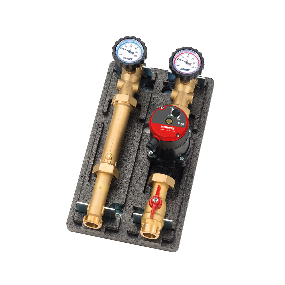 Grupo hidráulico directo, para instalaciones de radiadores, fan-coils o para la carga de acumuladores de ACS en las que no es necesario el control de la temperatura de impulsión. Construido con piezas fabricadas en latón, específicamente diseñadas para un óptimo funcionamiento del grupo hidráulico.