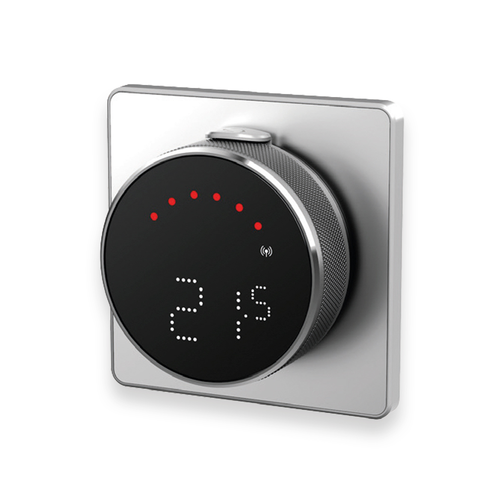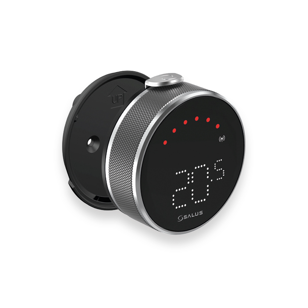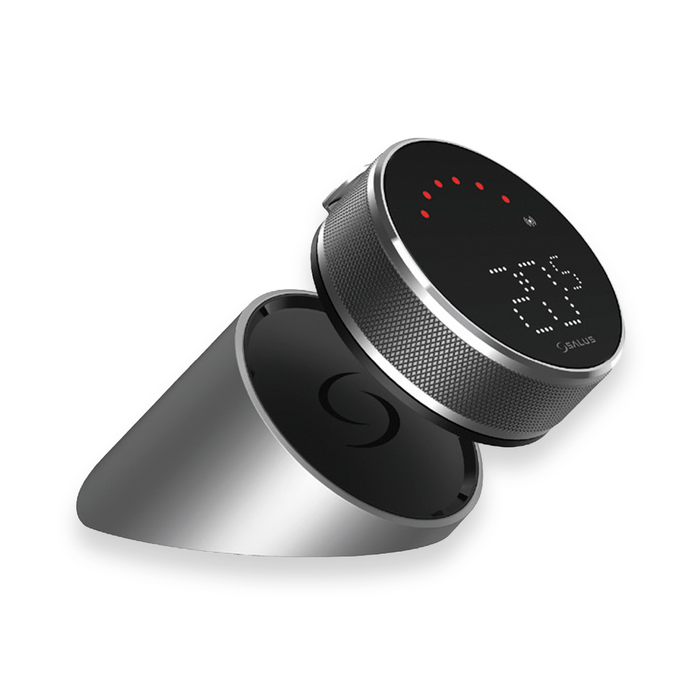 Termostato frío/calor vanguardista y diferenciador, programable desde la App SALUS Premium Lite. Montura Deluxe metálica giratoria, pulsador para acceso a menú y atractivo display negro con LEDs. Batería de iones de litio recargable mediante una estación de carga de diseño muy moderno.
