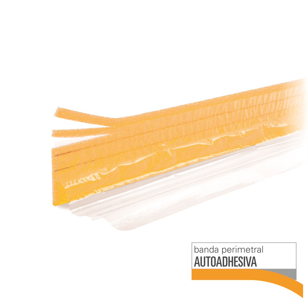 Fabricada en espuma de polietileno de color naranja, autoadhesiva por su parte posterior para permitir una fijación sobre la pared de forma rápida, sencilla, cómoda y segura. Ofrece un aislante termo-acústico entre las partes verticales de la edificación y el suelo. Tiene un espesor de 8 mm y una altura de 130 mm. Incluye un babero de polietileno para proteger la junta entre la placa y la propia tira evitando derrames de mortero. Gran capacidad para absorber dilataciones de la placa de mortero.