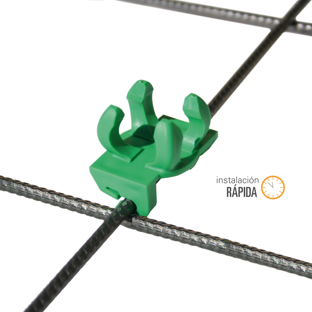 Clip Sysclima patentado y de moderno diseño para fijar los tubos del suelo radiante cómodamente y de forma segura sobre el mallazo. El tubo queda levantado aproximadamente 11 mm sobre el mallazo, evitando en cualquier caso el contacto directo entre mallazo y tubo. Según la posición en la que se coloquen los clips, se pueden utilizar para tubos de 16 mm o de 20 mm de diámetro. Existen clips para diferentes grosores de tramado de mallazo (4 mm, 5 mm y 6 mm).