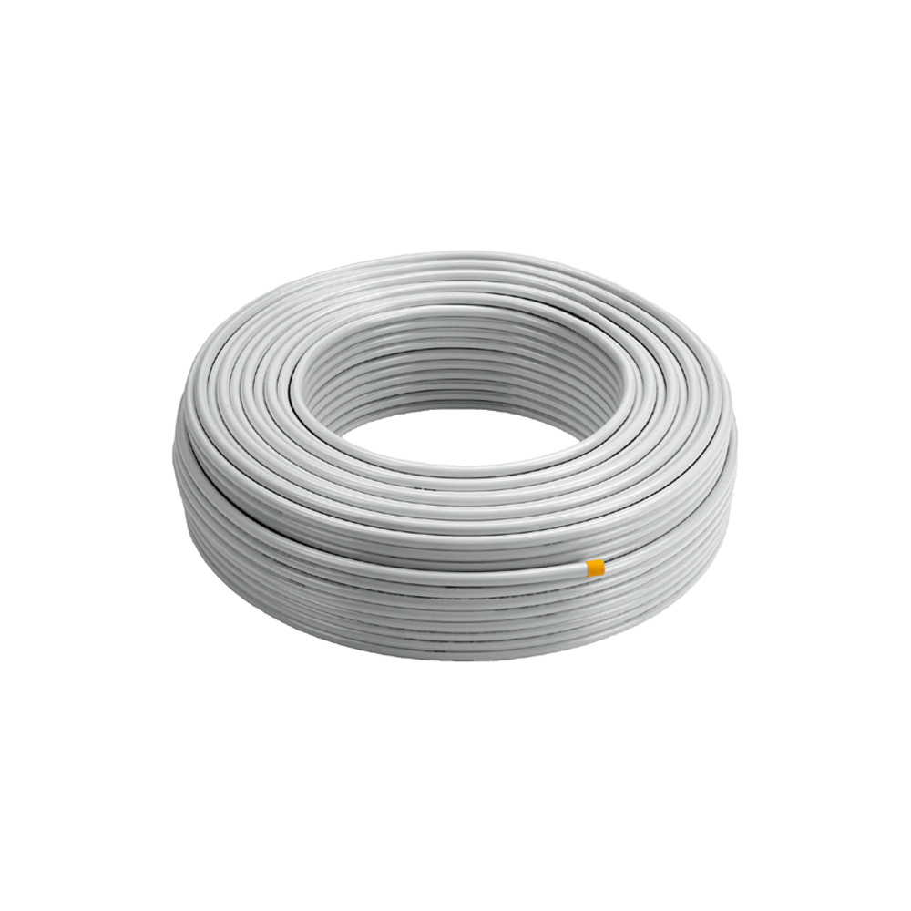 Tubo multicapa PERT/AL/PERT de diámetro 14 mm y espesor de pared de 2 mm con una lámina interior de aluminio de 0,2 mm de espesor que a la vez actúa como barrera antidifusión de oxígeno.